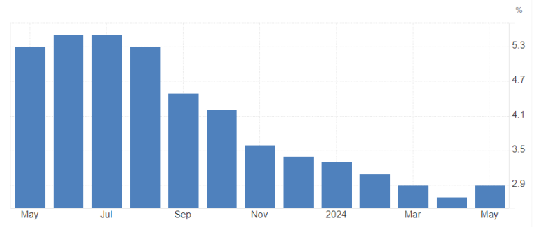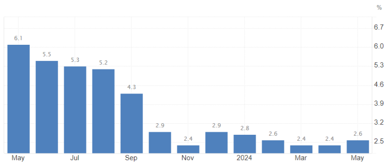 Core inflation is on the same path. We did not yet get the May data, but April came in at 0.6% MoM compared to the same reading on the headline for April. YoY we see a well-declining chart, maybe bottoming out a bit between 2.5 and 3% as well now going forward.