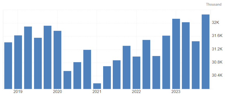 Unemployment in the Euro Area is steady around 6.5% so far, with no real sign of any changes there yet. An interesting but mostly overlooked fact is the move from full-time employment to part-time employment, with the latter clearly on the rise since the bigger COVID dip.