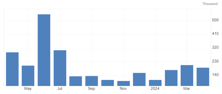 ADP: Expected is a change of +173k. We didn’t see a lot of changes in that report in the last 3 months, coming in at +176k in February, +208k in March, and +192k in April.
