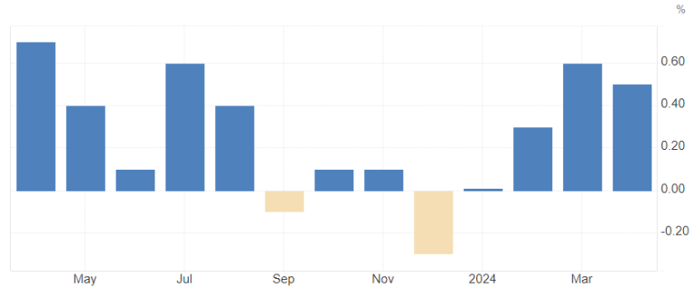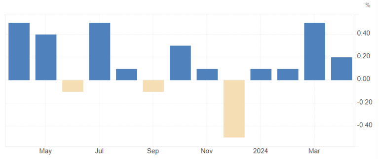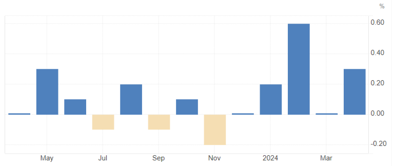 The low came in for November 2023 at -0.2% MoM and jumped to +0.6% in February. Since then it cooled down a bit with a 0.0% and a 0.3% reading.