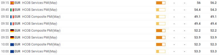 We then get European HCOB services PMIs for May – lots of those are expected to stay flat with the last report – I think we could be in for some surprises there, but price impact is probably limited still. Nevertheless, keep an eye on that! Dropping from 07:15 to 08:00 GMT.