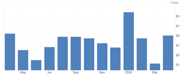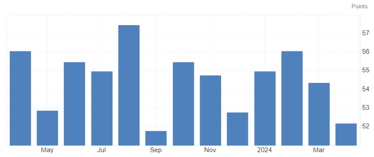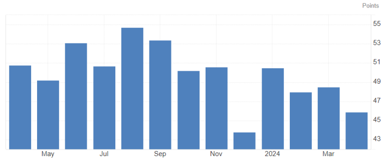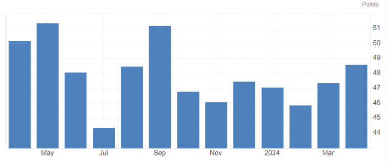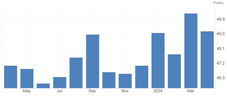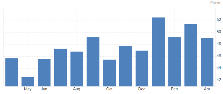 We already saw the last couple of months on the headline being relatively stable just below the 50 mark, with the last one for April coming in at 49.2 vs. a consensus of 50.0.