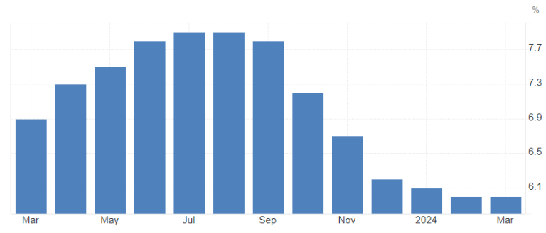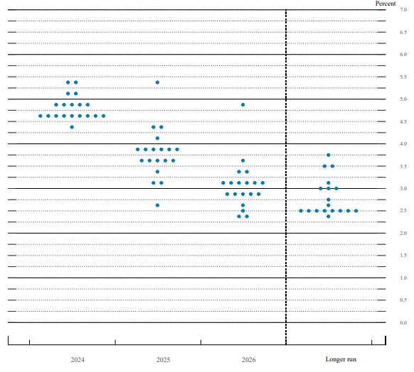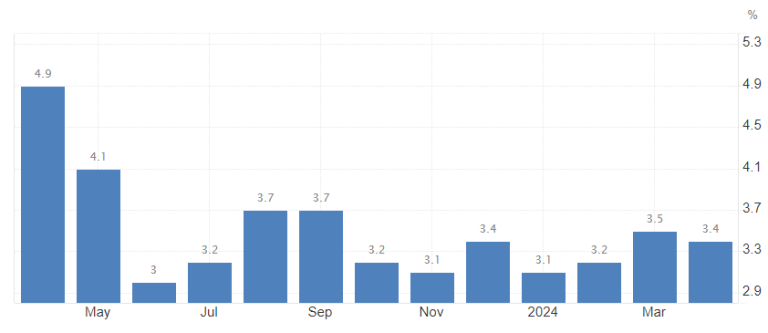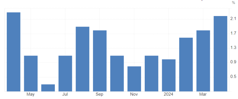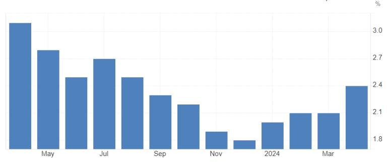 Note that the forecasted median PCE inflation for 2024 was sitting at 2.4% YoY and core PCE inflation at 2.6% as of the last report from March. Since February, the core PCE report has come in steadily at 2.8% YoY, with MoM readings only slowly coming down from the spike in January.