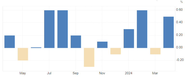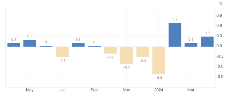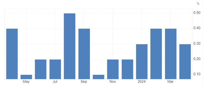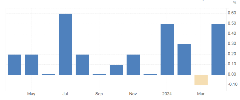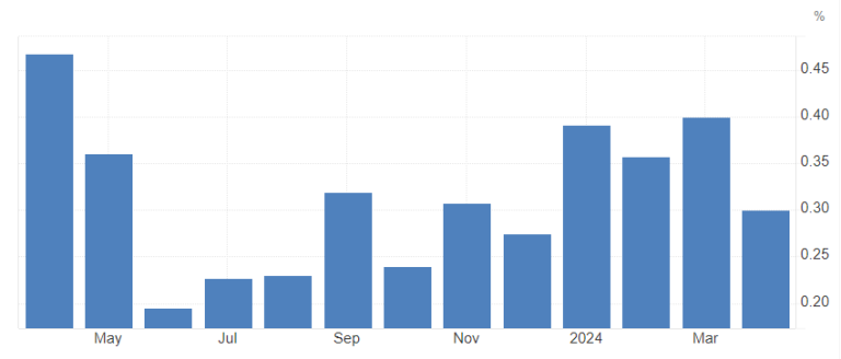 Core PPI is expected to come in at 0.3% MoM vs 0.5% in the April data. YoY is expected to hit at 2.5% (2.3% whisper) vs 2.4% last time.